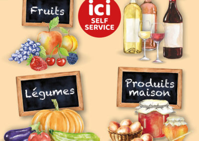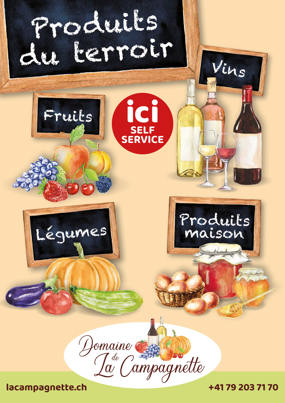 Vins, jus de pommes, fruits, légumes, confitures, œufs, miel, céréales « Granola », …